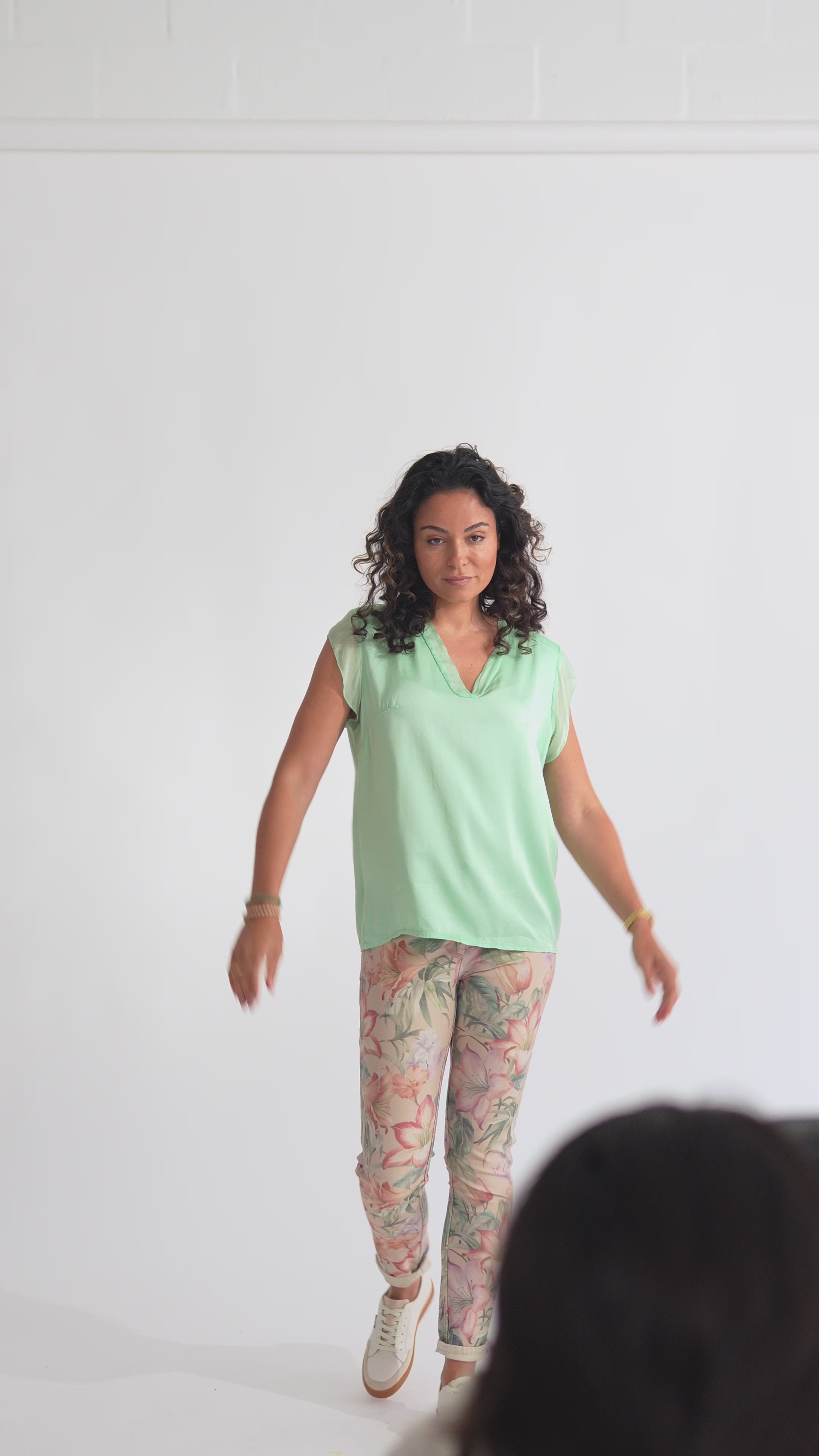 Italian Satin V Neck tee with Silk Trims in Aqua